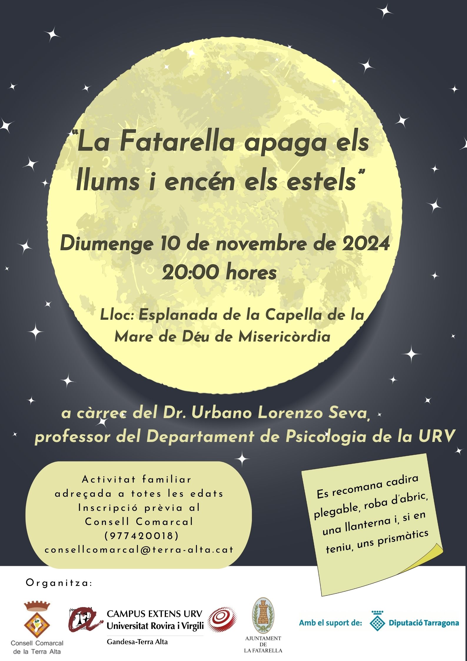 Activitat familiar adreçada a totes les edats. Observació astronòmica dirigida pel Dr. Urbano Lorenzo Seva, professor del Departament de Psicologia de la URV.