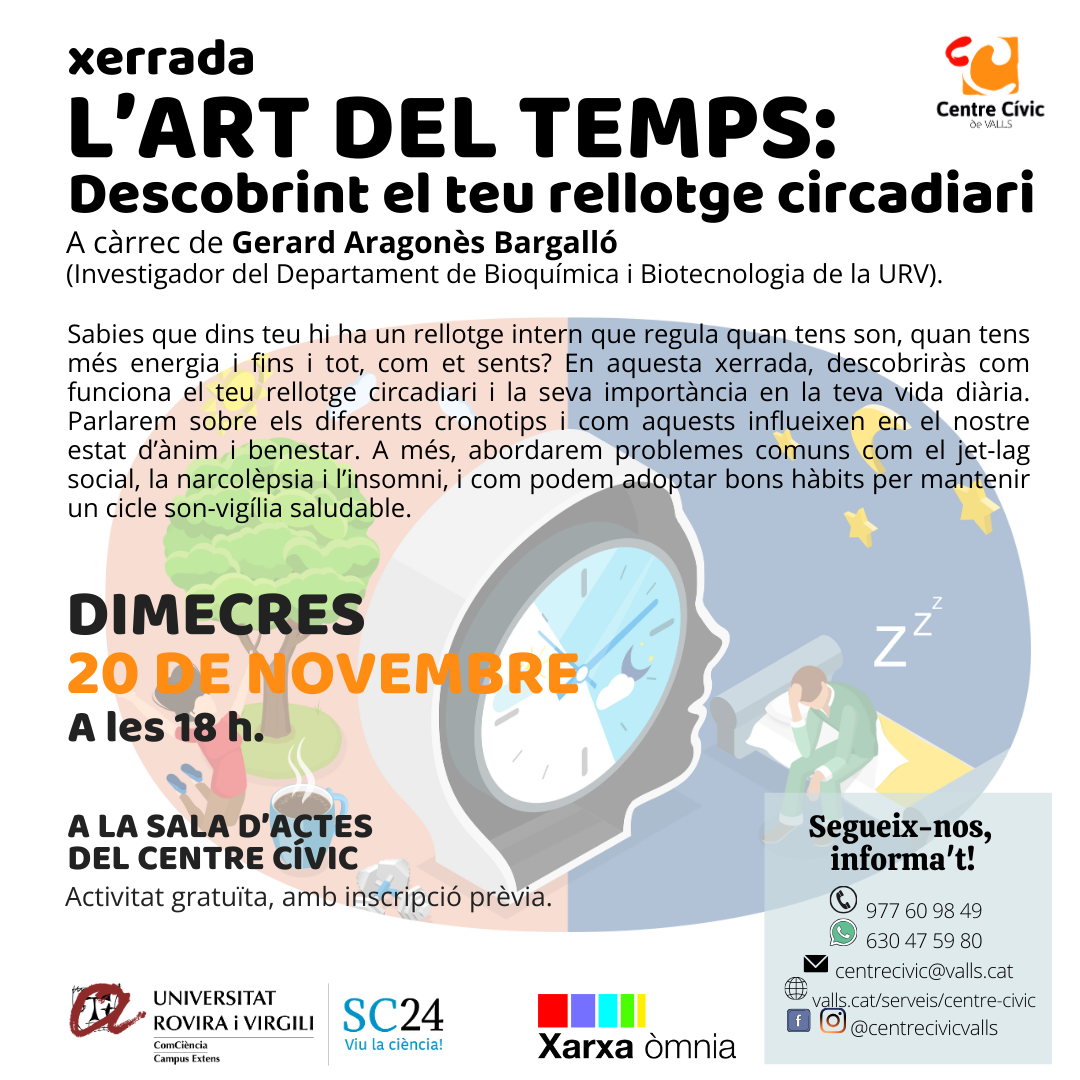 Sabies que dins teu hi ha un rellotge intern que regula quan tens son, quan tens més energia i fins i tot, com et sents? En aquesta xerrada, decsobriràs com funciona el teu rellotge circadiari i la seva importància en la teva vida diària. Parlarem sobre els diferents cronotips i com aquests influeixen en el nostre estat d'ànim i benestar. A més, abordarem problemes comuns com el jet-lag social, la narcolèpsia i l'insomni, i com podem adoptar bons hàbits per mantenir un cicle son-vigília saludable.