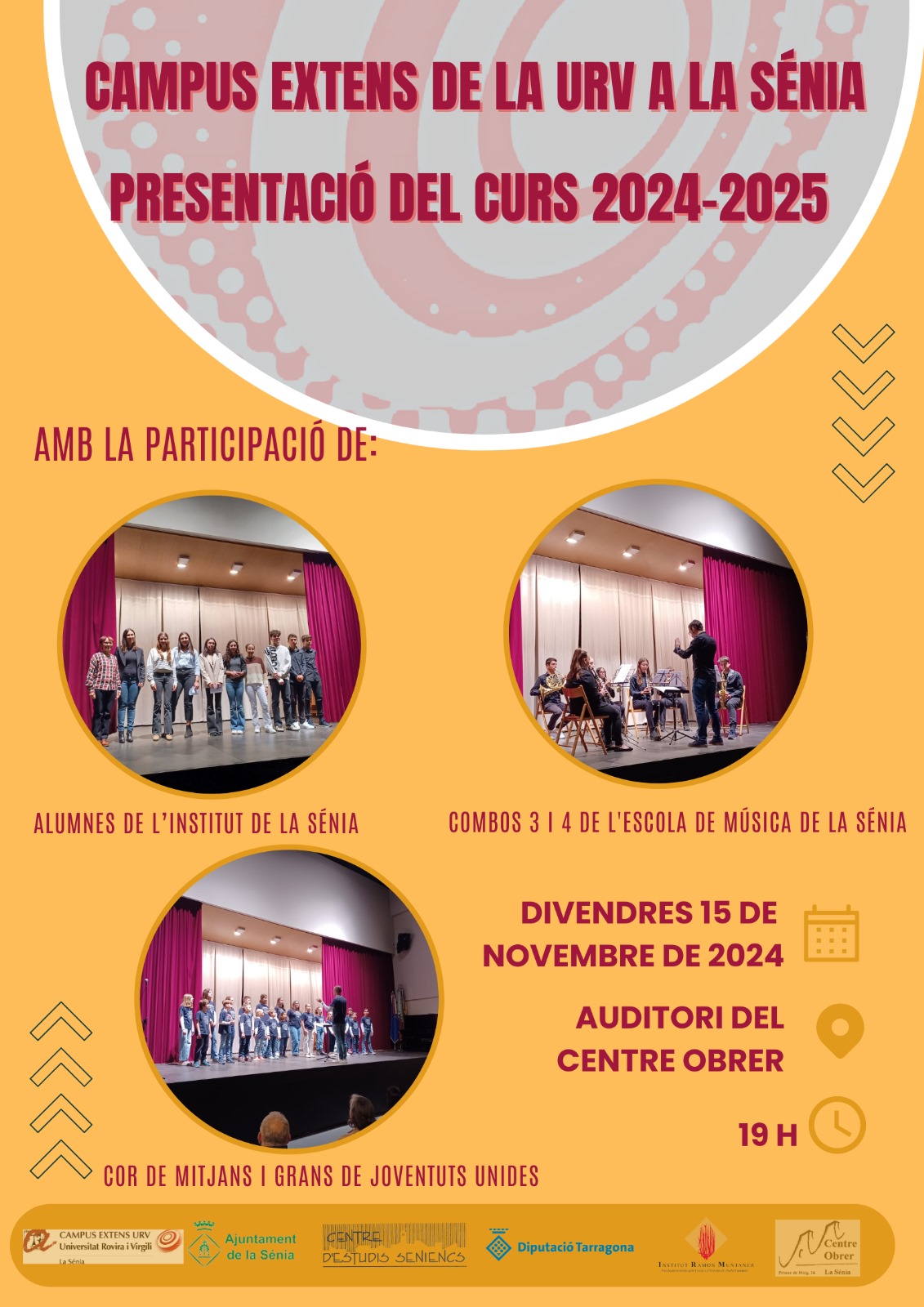En una segona part, les intervencions de Victòria Almuni, alcaldessa de la Sénia, i Jordi Diloli, vicerector de la URV, donaran pas a dues actuacions musicals molt especials. La primera, a càrrec de la Coral de Mitjans i Grans de Joventuts Unides, i la segona a càrrec dels integrants de l’Escola de Música de la Sénia.