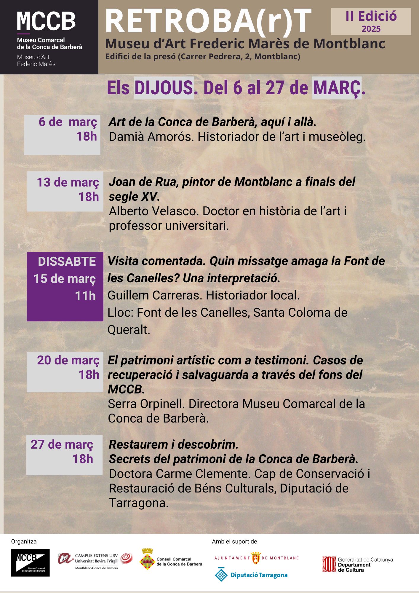 Acte organitzat pel Museu Comarcal de la Conca de Barberà, El Consell Comarcal de la Conca de Barberà, per la seu del Campus Extens de la URV a Montblanc-Conca de Barberà, amb el suport de la Diputació de Tarragona.
