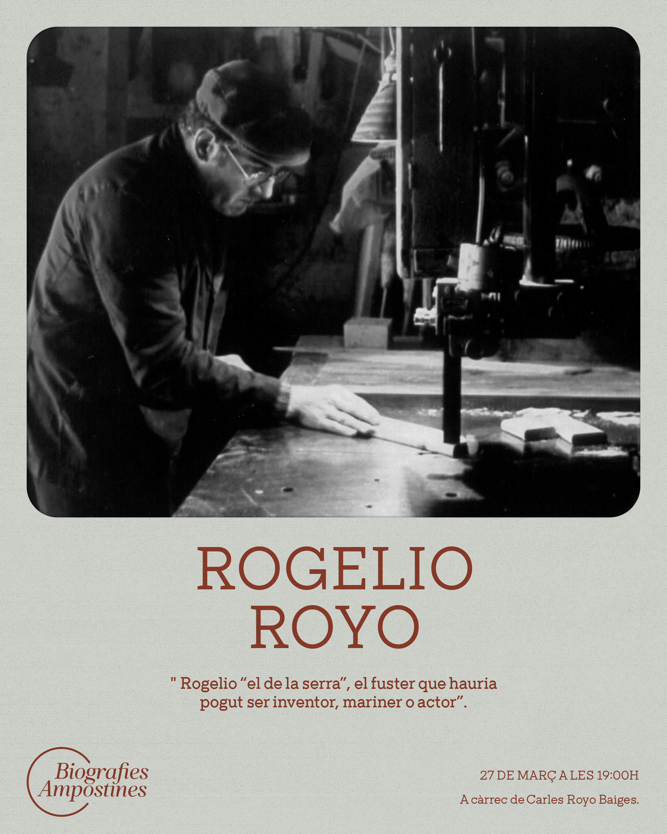 Rogelio "el de la serra", el fuster que hauria pogut ser inventor, mariner o actor. Tercera i última conferència decartelll cicle de conferències "Biografies Ampostines", del que presentem la 14ª edició, que té com objectiu recuperar i divulgar les vivències i els treballs realitzats per persones vinculades amb la ciutat d'Amposta. A càrrec de Carles Royo Baiges.