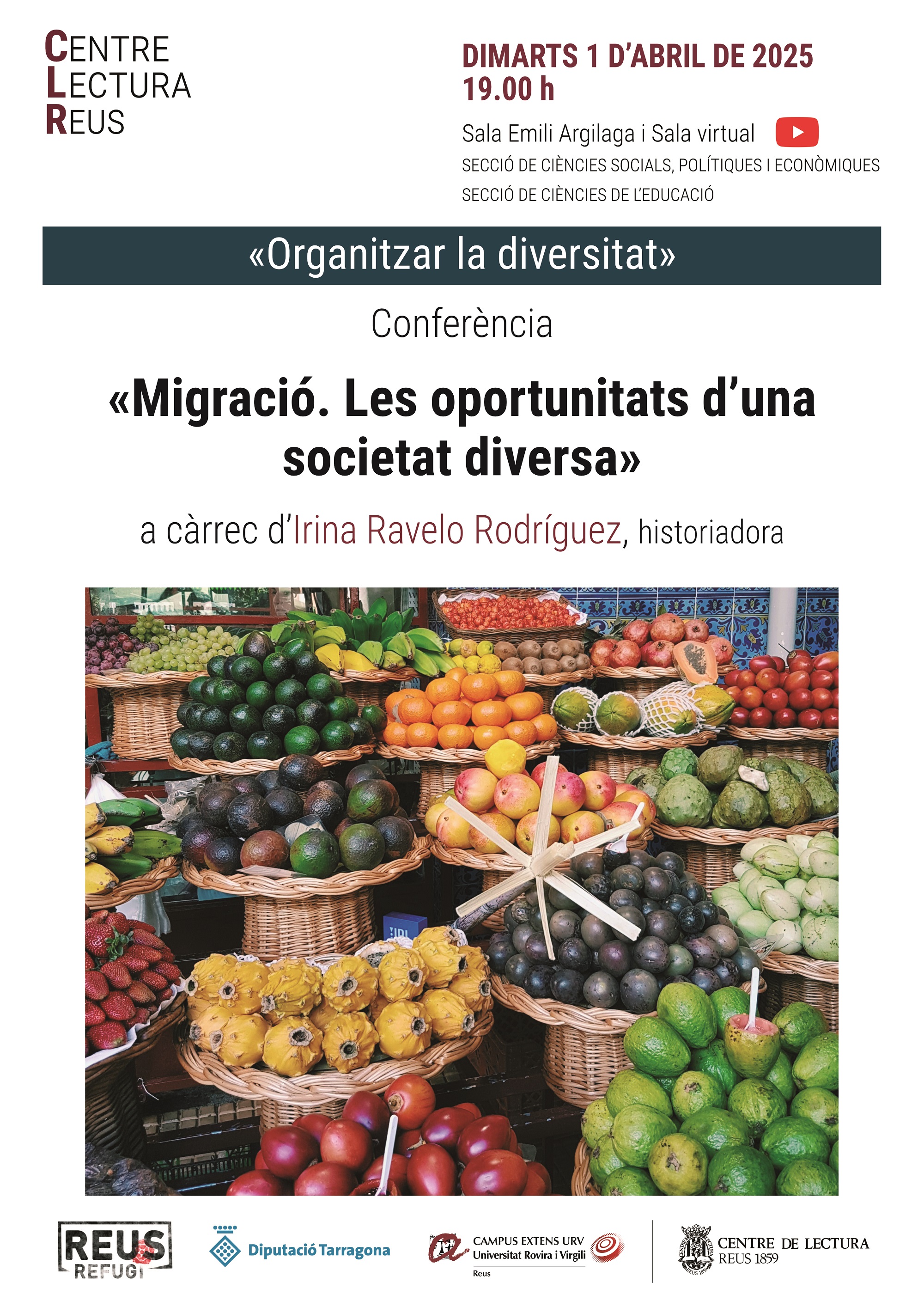 Dimarts 1 d’abril, a les 19h, a les sales Emili Argilaga i virtual, cicle «Organitzar la diversitat»: conferència «Migració. Les oportunitats d’una societat diversa», a càrrec d’Irina Ravelo Rodríguez, historiadora.